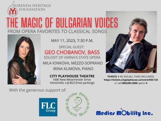 https://tickets.cityplayhouse.ca/event/655:133 or call (905)303-2000 option 4 We are excited to invite you to an unforgettable journey through beloved musical masterpieces. For the First time in Canada, Aurenda Heritage Foundation presents: Geo Chobanov - one of the finest contemporary Bulgarian basses, and the Canadian mezzo-soprano Mila Ionkova. Mila’s glamorous stage presence and undisputed talent combined with...